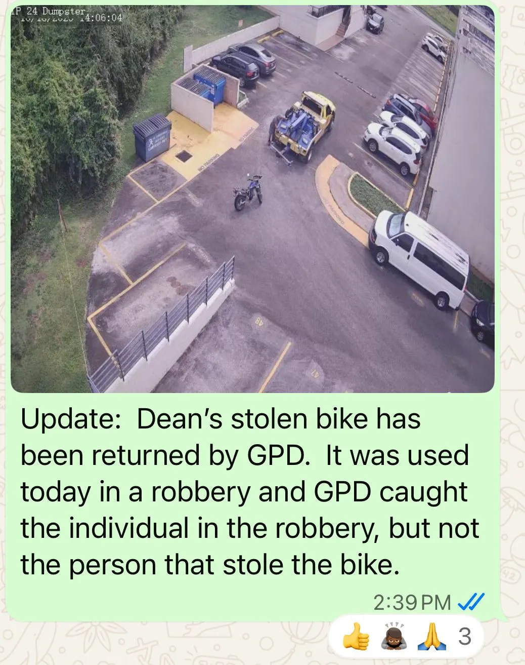 Unit F12 stolen motorcycle has been returned by GPD. It was used today in a robbery, and GPD caught the individual involved. But, not the actual thief of the vehicle. It was used in a drug trade.
